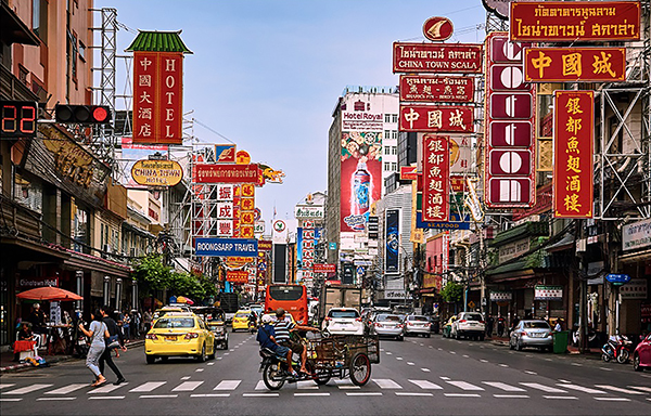 Tailandia, cuenta con una de las comunidades chinas con más presencia. Mercados, múltiples negocios, puestos de comida callejera, tráfico constante y bullicio, crean un ambiente afín al de la propia china. En las noches, las luces de neón de los letreros se encienden creando una atmósfera con mucha vida y actividad.