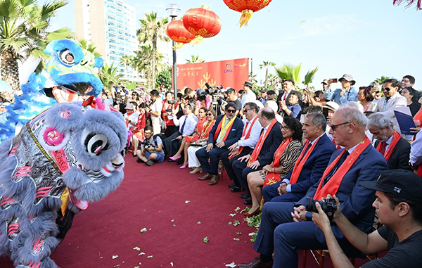 La danza del dragón y de los leones marcó el inicio de la jornada festiva, para luego el embajador Song Yang dirigiera un mensaje, teniendo como invitados estelares al canciller Javier González-Olaechea, a los titulares deL MINCETUR, Juan Mathews, y del (MINCUL), Lesly Urteaga, a los alcaldes de Lima, Rafael López, y de Miraflores, Carlos Canales, al Inspector de Primer Nivel de la Oficina de Cultura y Turismo de China, Pang Wei, y el Jefe de la Estación Central de Radio Televisión China, Zhu Boying, entre otras autoridades.