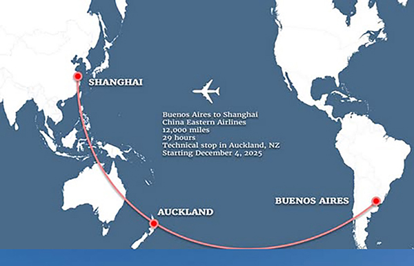 El primer vuelo de la nueva ruta aérea directa entre China y Argentina aterrizó en Buenos Aires tras realizar un viaje de un día que incluyó una escala en Auckland, Nueva Zelanda, marcando el lanzamiento histórico de un servicio vital que conecta tres continentes.