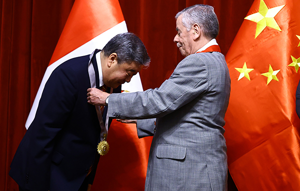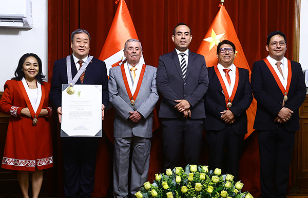 En ceremonia realizada en la sede parlamentaria, el Congreso de la República impuso la Medalla de Honor en el Grado de Gran Oficial e hizo entrega del correspondiente Diploma al embajador Extraordinario y Plenipotenciario de la República Popular China Song Yang, en acto que contó con la participación del presidente de la República José Jerí.